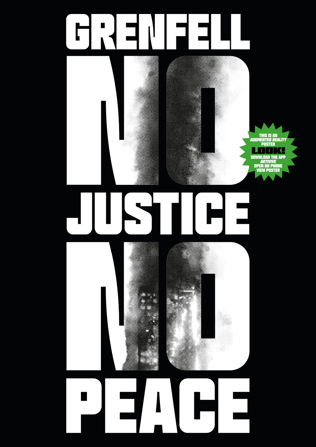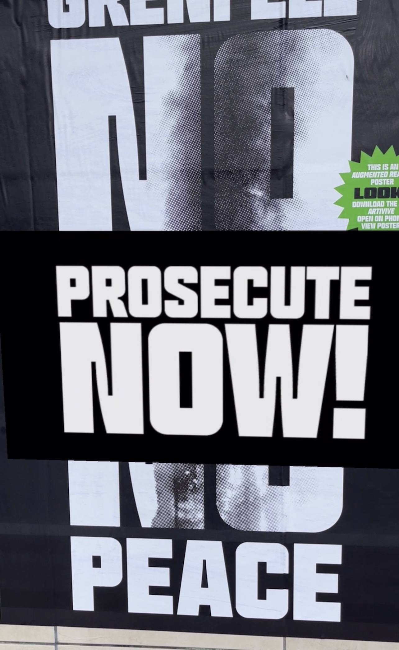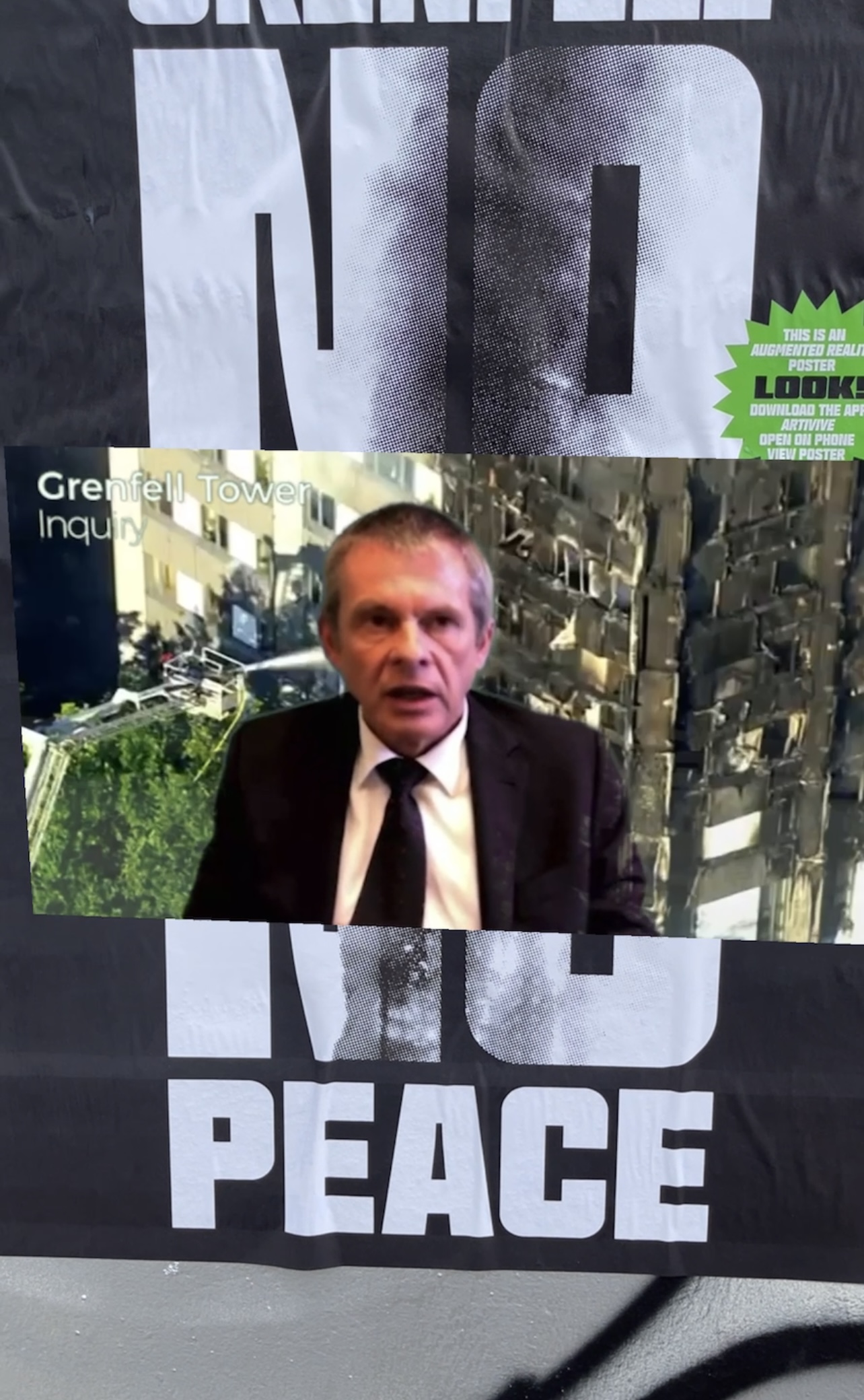 No Justice, No Peace is an augmented reality poster that is being fly posted in London throughout the Summer as the inquiry continues. By using the free App, Artivive viewers can see and hear the different specially created viral videos of the corporate and council leaders testimonies taken from public inquiry if they hold their phones up to the poster. Putting those testimonies from the inquiry to the Street.