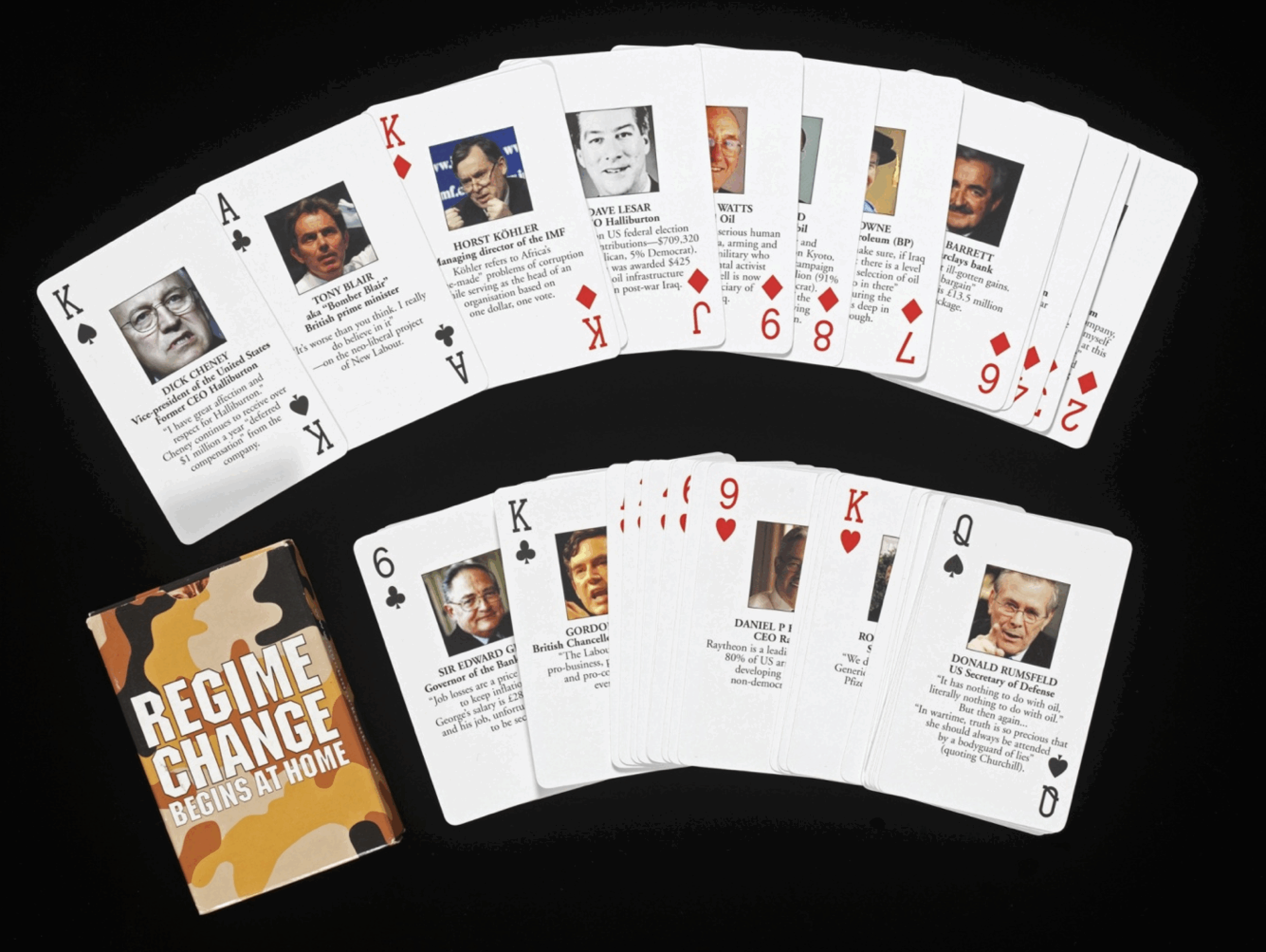 The Regime Change Begins At Home playing cards published with Bookmarks Publications in the UK and The New Press in the US were produced with editorial assistance from Emma Bircham. During the height of the global Anti-War Movement during the period between 2003-5 they sold over 30,000 copies in the UK, US, Europe and Japan.