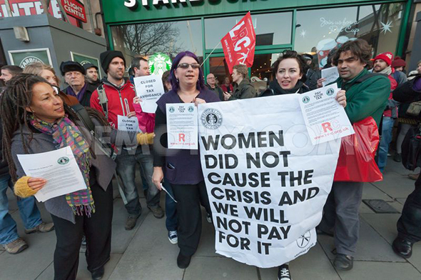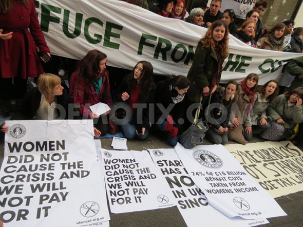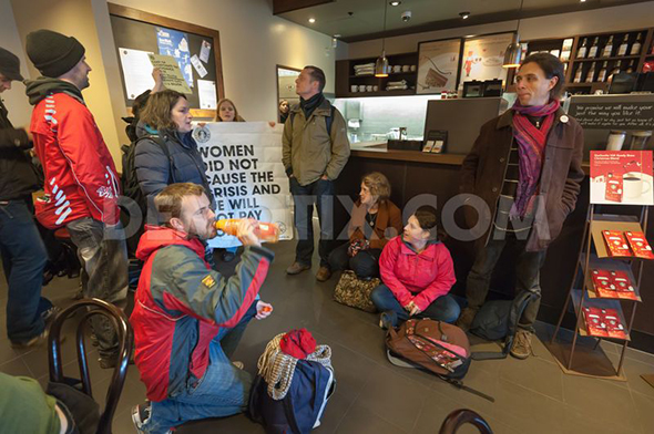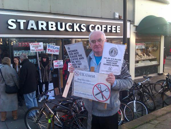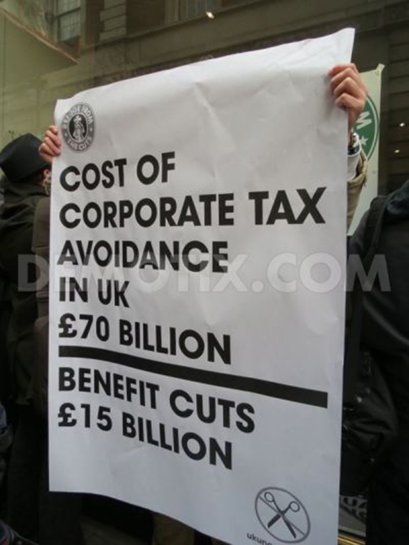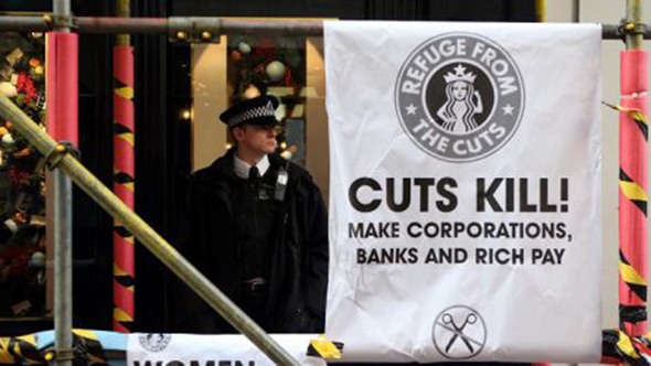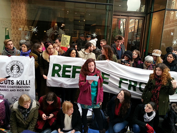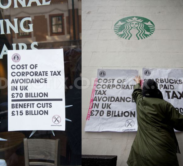 I helped produce some posters for UK Uncut’s Refuge From The Cuts action against Starbuck’s Tax Avoidance that turned various branches of Starbucks into creches, refugees and other places that are being cut in the austerity drive. The posters help get the message across in the media image of the action,  and were available for download before the action so people could use them around the country.