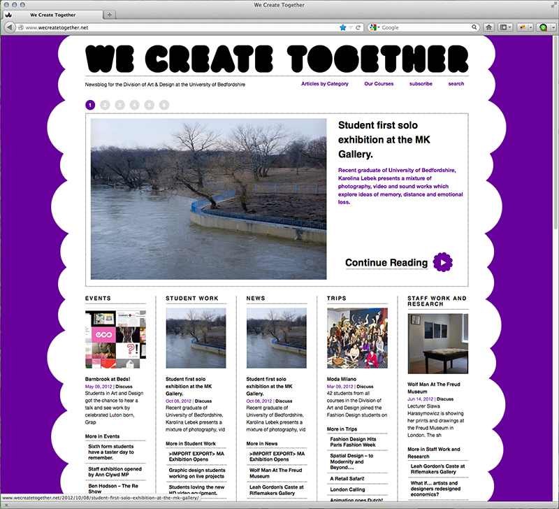 Development, template design and typeface design, for We Create Together a newsblog for the Division of Art and Design at the University of Bedfordshire.
