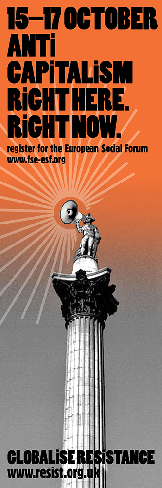 close Anti-Capitalism Right Here, Right Now Globalise Resistance sticker for the European Social Forum in London 2004