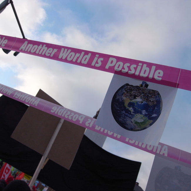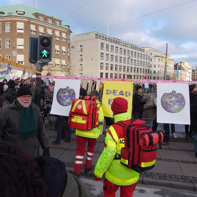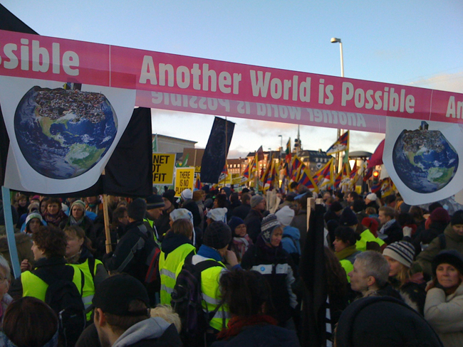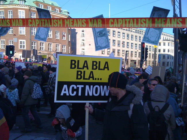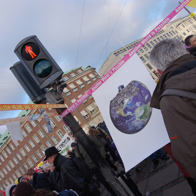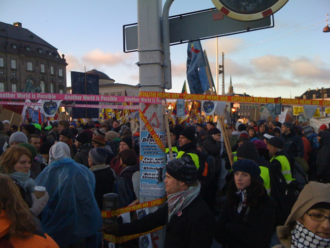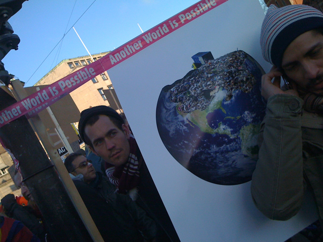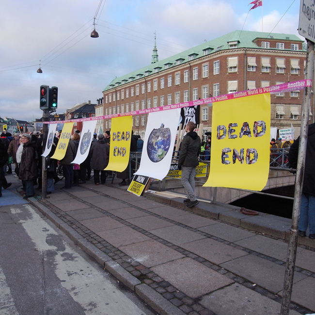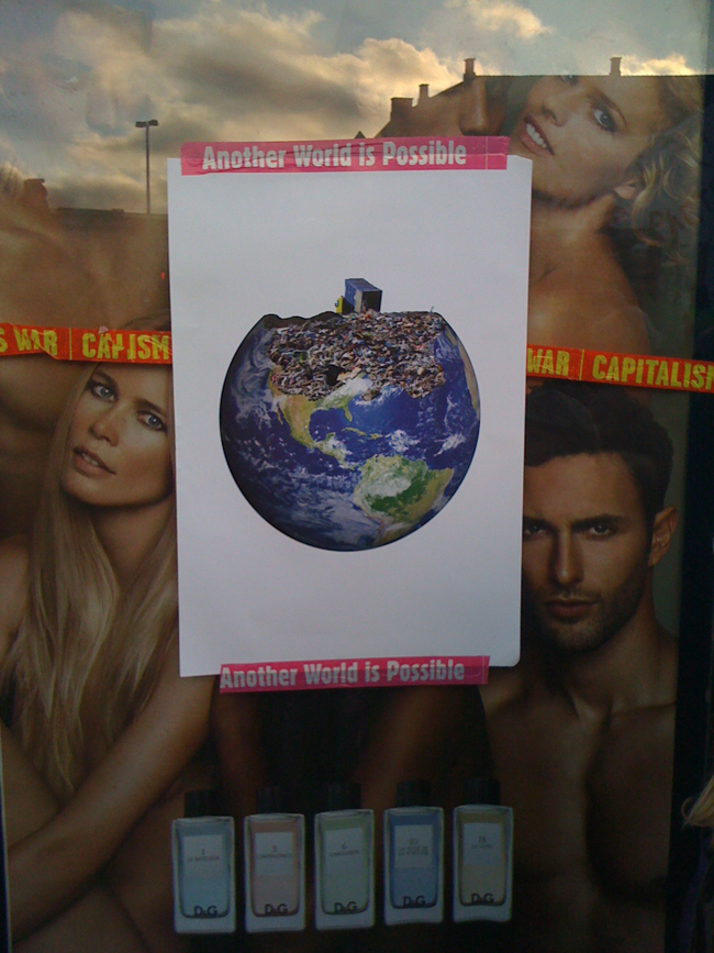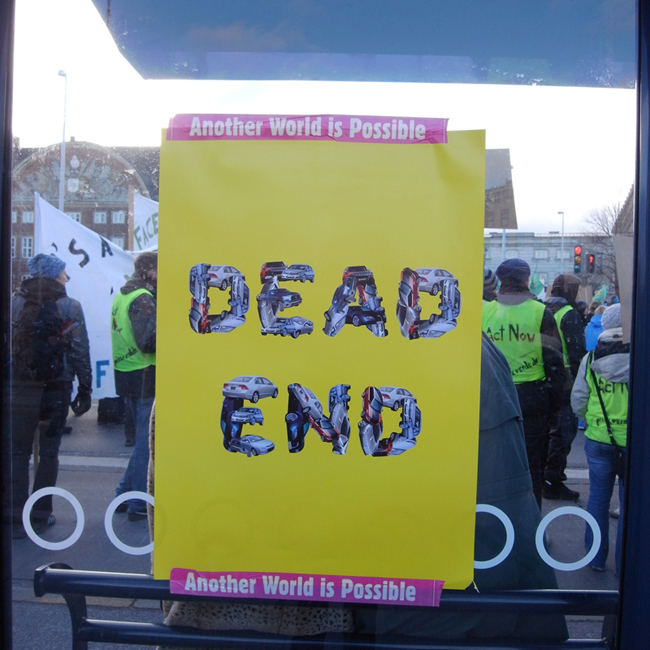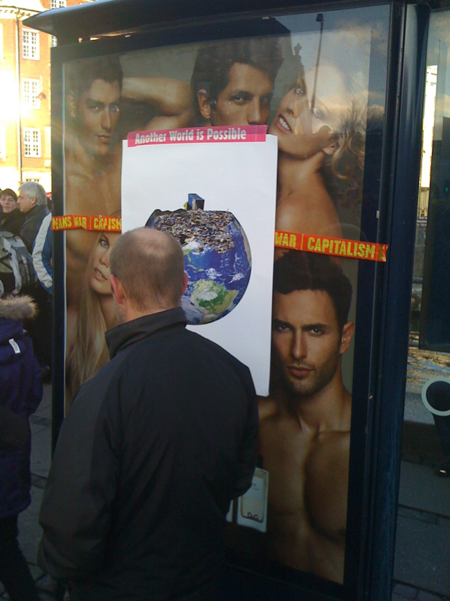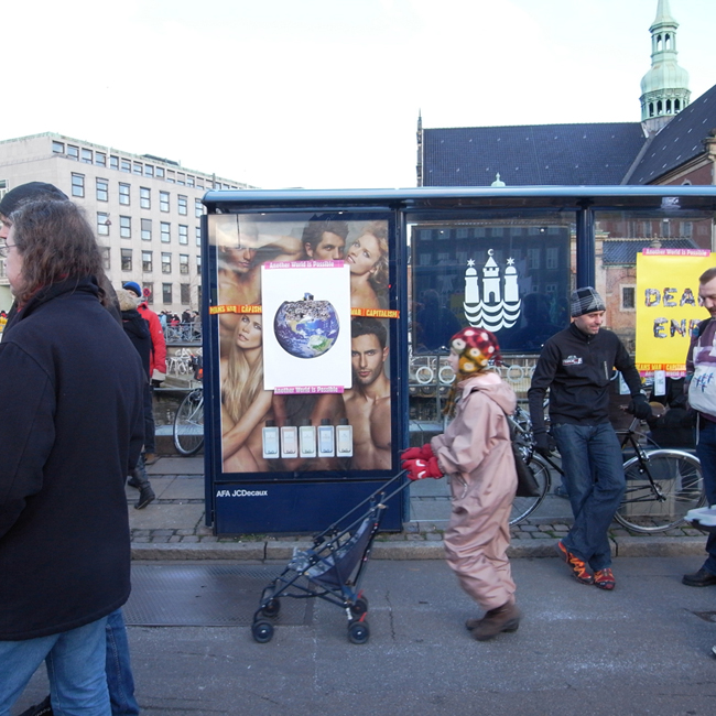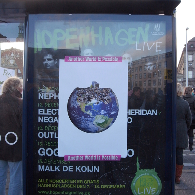 Lots of hopes were pinned on this UN Summit, but rather than address the very serious problems we all face globally the US and China decided to put their own interests before everyone else and announce a last minute ‘accord’. Activists from around Europe mobilised and attempted to link with radical groups, NGO’s, Via Campesina (the largest peasants organisation in the world) and government ministers from the South who did not believe in the deal and who are already suffering the effects of Climate Change. After a massive demonstration of 150,o00 people, the next day was a day of Direct Action were as we protested outside, the groups just mentioned came from within the conference to come out to try meet us outside in the summit car park, both sides were beaten back violently by huge Danish Riot Police as they attempted to push non-violently through Police lines to meet each other. We were to hold a Peoples Assembly about the real solutions to run away Climate Change, should we achieve this, this still happened but not quite where we intended! This is some of the work I put up round town.