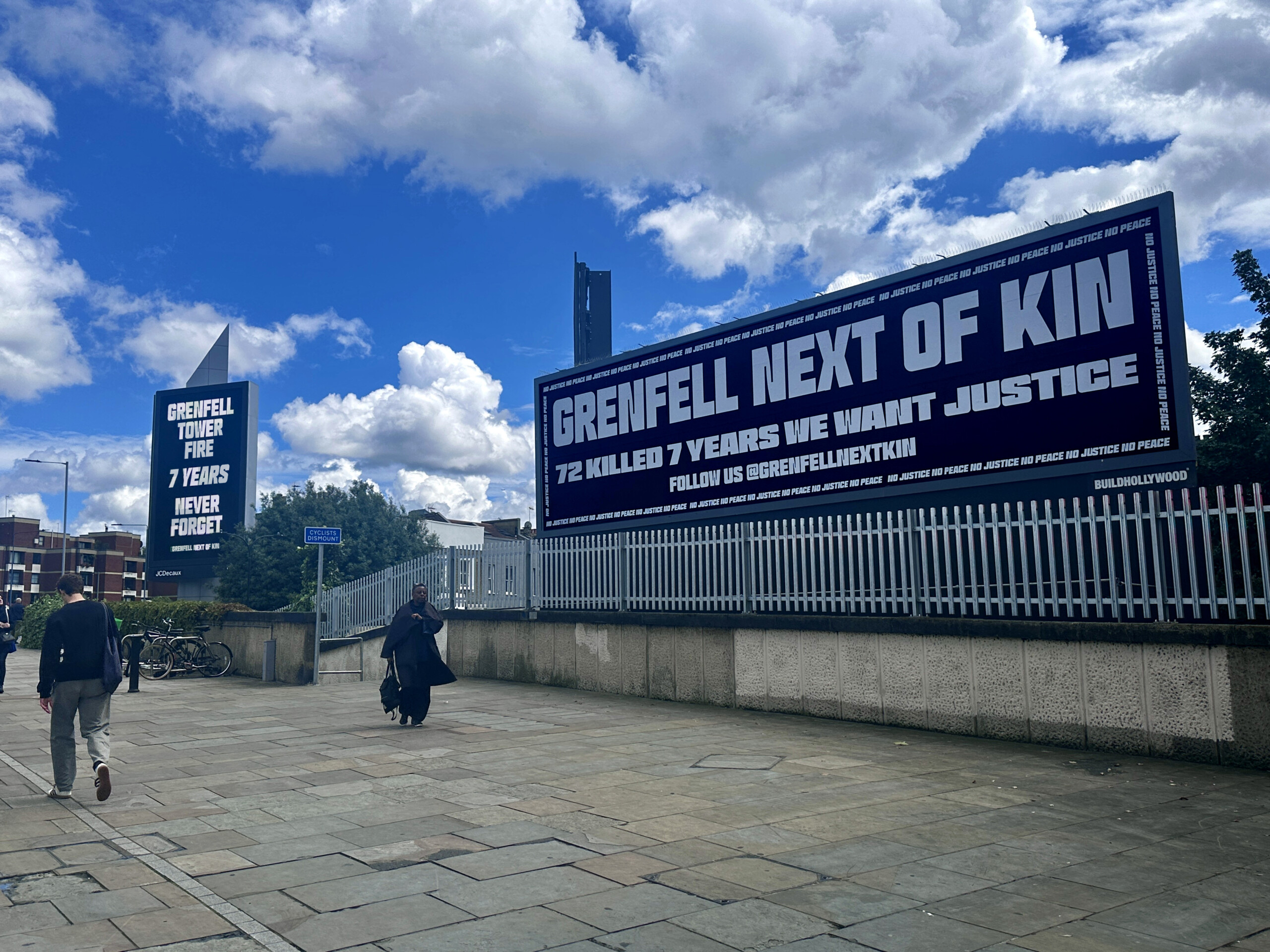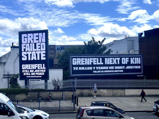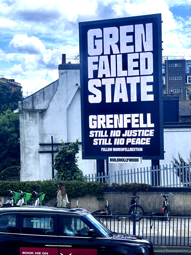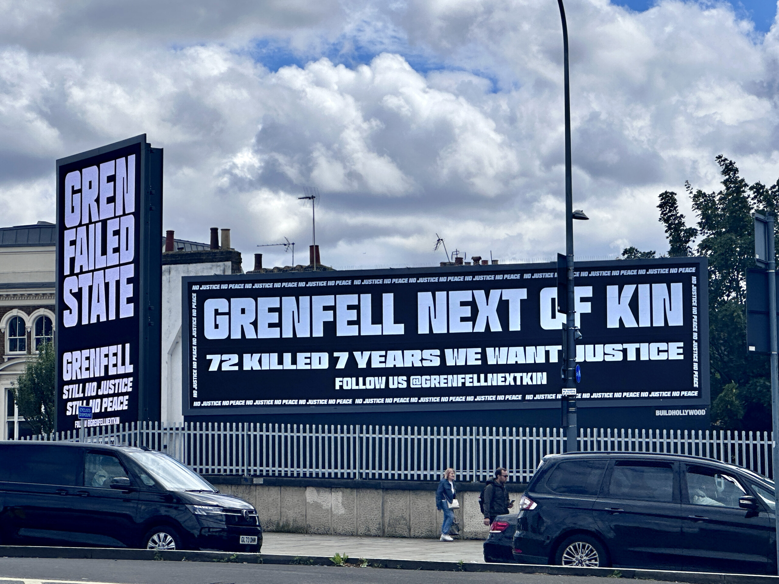 close Grenfell Next of Kin Grenfailed State, We Want Justice Billboards Thank you to Build Hollywood for the support, billboard takeover at Shepherd’s Bush Roundabout June 14th 2024.