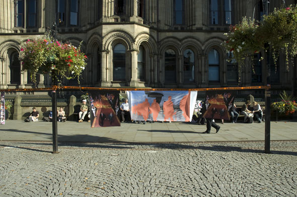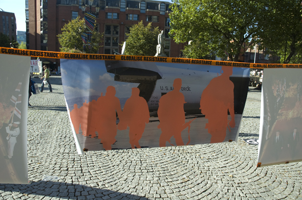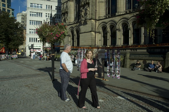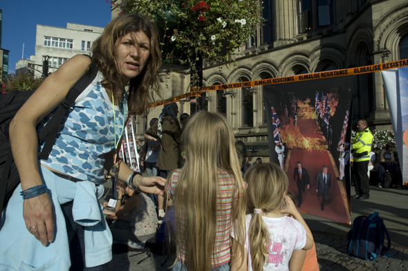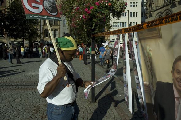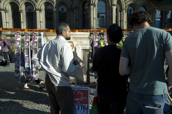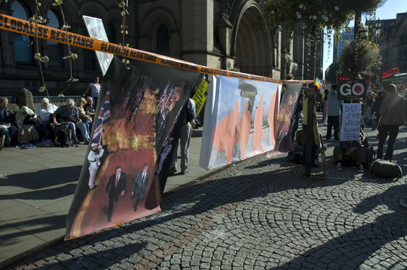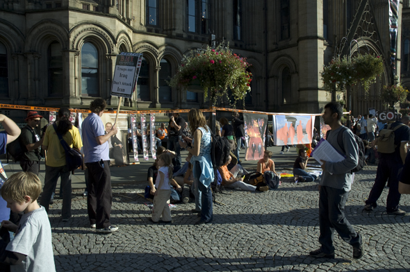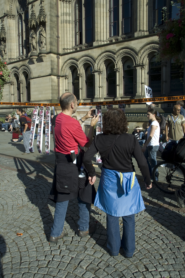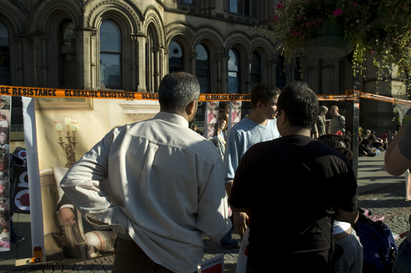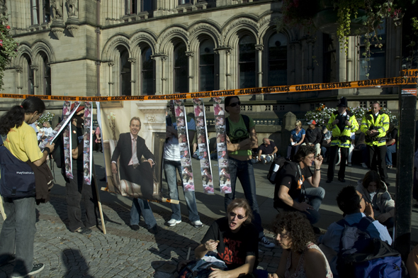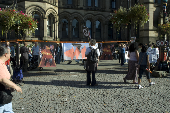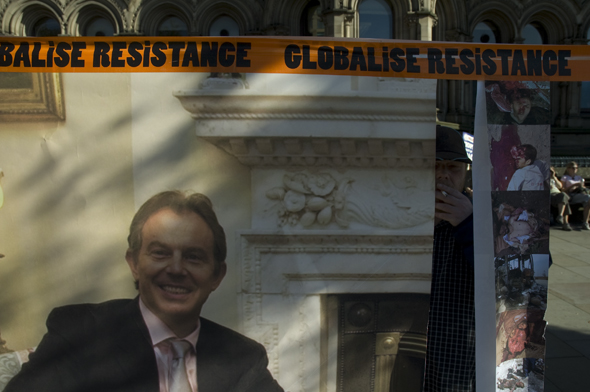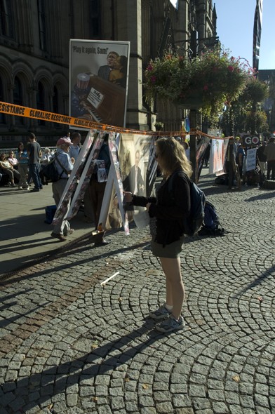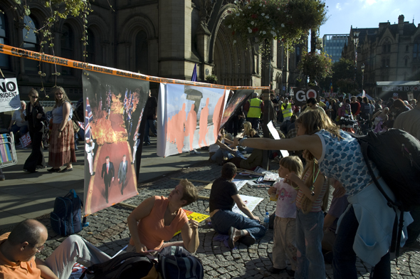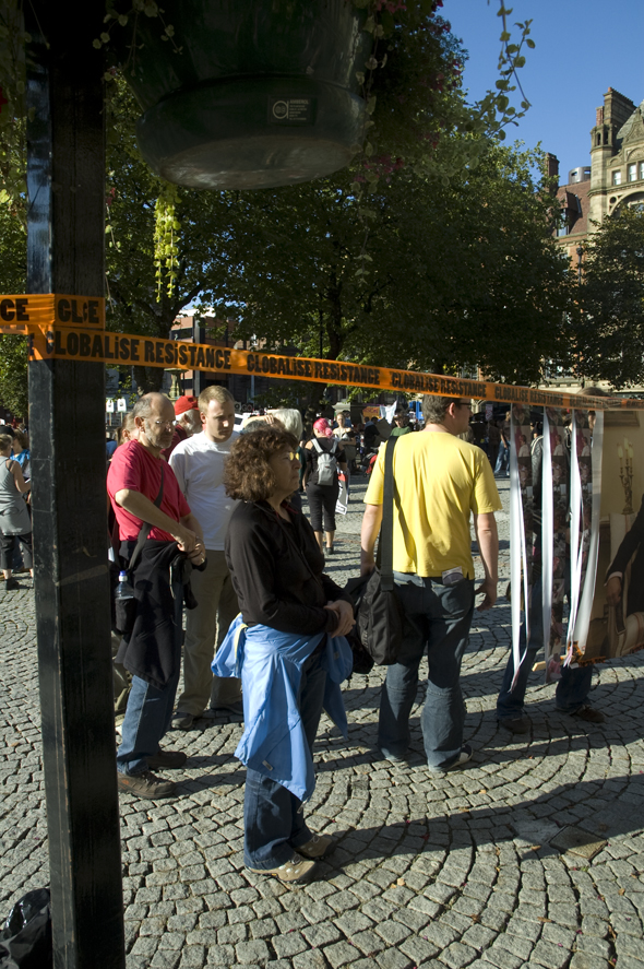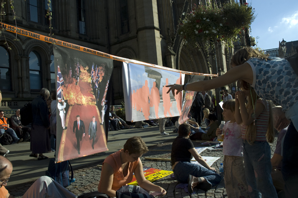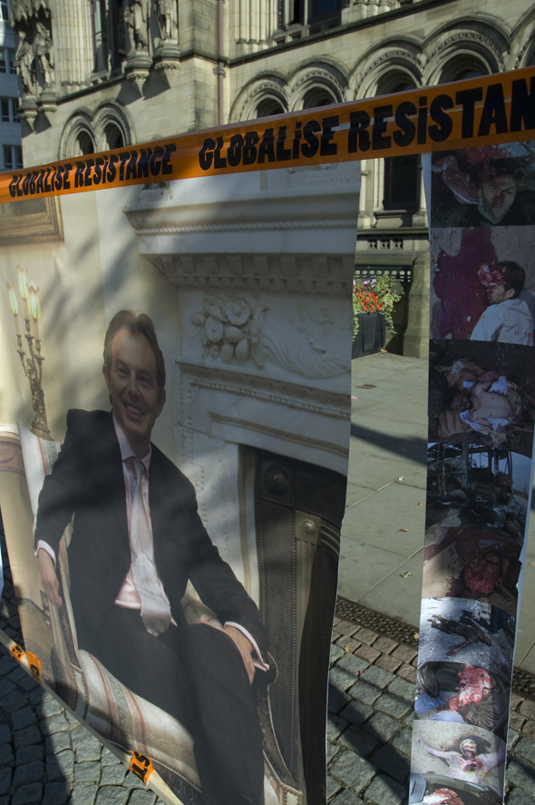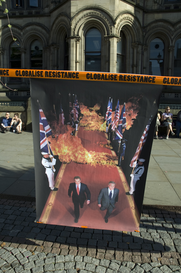 A big demonstration called by Stop The War in Manchester that surrounded the Labour Party conference in protest at the wars in Iraq and Afghanistan. I put up posters that juxtaposed Tony Blair and George Bush with small images of dead Iraqi and Afghan civilians taken from the Internet. When I put these posters up in the Central Square by the rally Police Officers got agitated and had to check with their CO’s about whether it was alright for my to publically show images of the victims in those countries. In the end they relented.