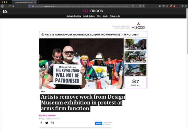 The Design Museum did install labels in place of the works which also included a statement from the museum’s directors setting out its position. This stated: ‘This artwork was removed at the request of the lender who has objected to a private event by an aerospace and defence company that was held at the Design Museum.’