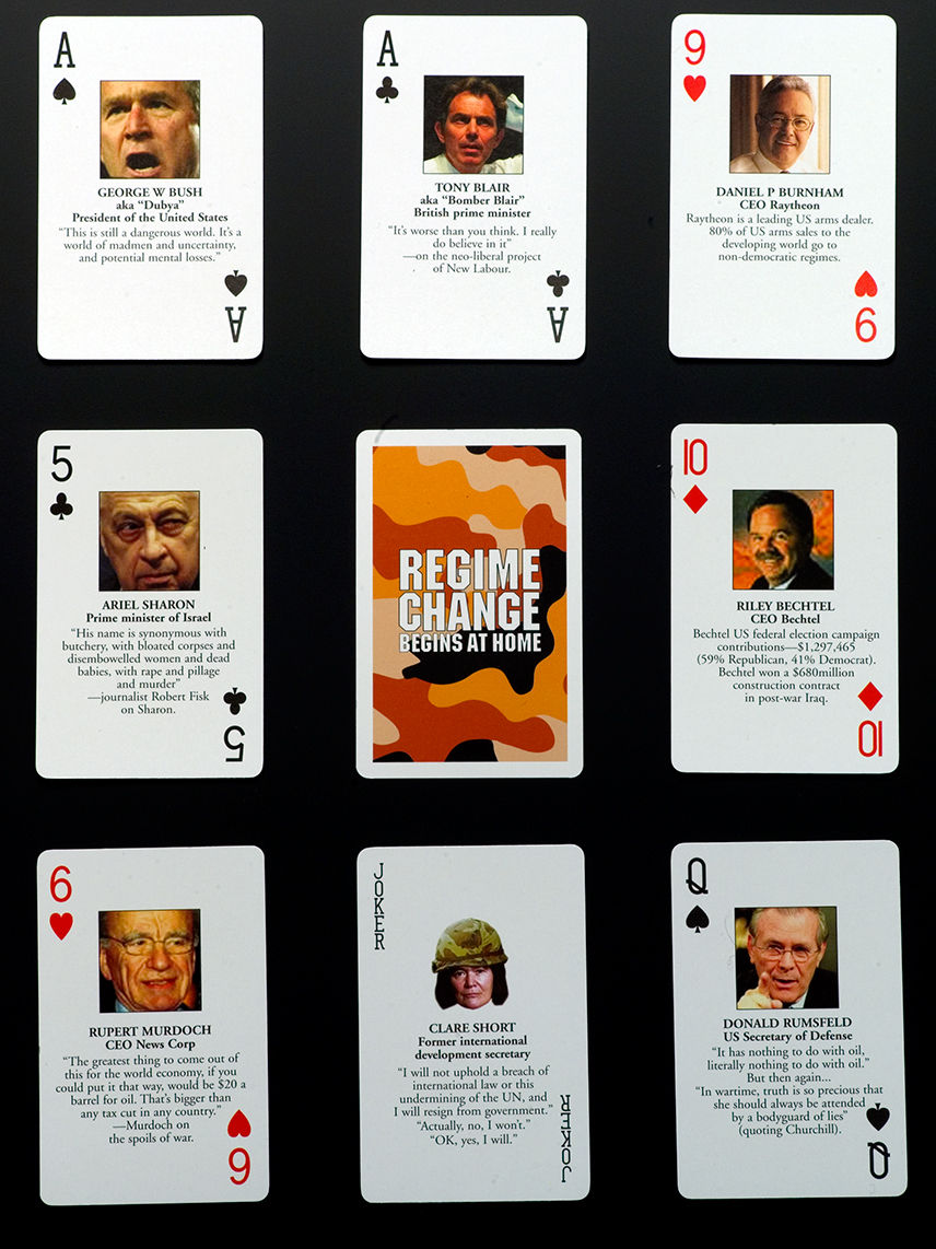 The Regime Change Begins At Home playing cards published with Bookmarks Publications in the UK and The New Press in the US were produced with editorial assistance from Emma Bircham. During the height of the global Anti-War Movement during the period between 2003-5 they sold over 30,000 copies in the UK, US, Europe and Japan.